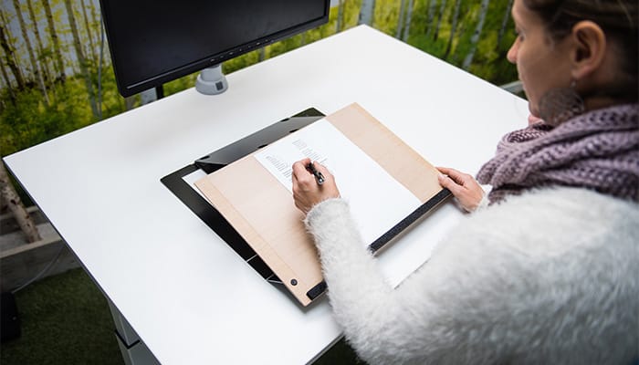 Zamiast twardej podniesionej krawędzi z przodu arkusza, zaprojektowaliśmy nasze uchwyty na dokumenty z miękką piankową podpórką na nadgarstek. Podczas robienia notatek nadgarstek może na niej spoczywać. Pozwala to na wygodne pisanie bez irytującego nacisku na nadgarstki.