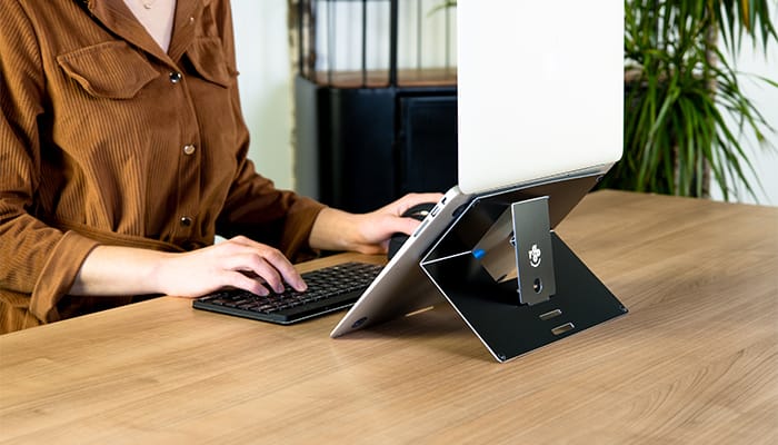 Ta podstawka na laptopa po prostu przykleja się do tylnej części laptopa za pomocą rzepów. Ponieważ jest przymocowana do laptopa, nigdy nie zapomnisz zabrać jej ze sobą. W ten sposób możesz pracować w zdrowej pozycji wszędzie!
